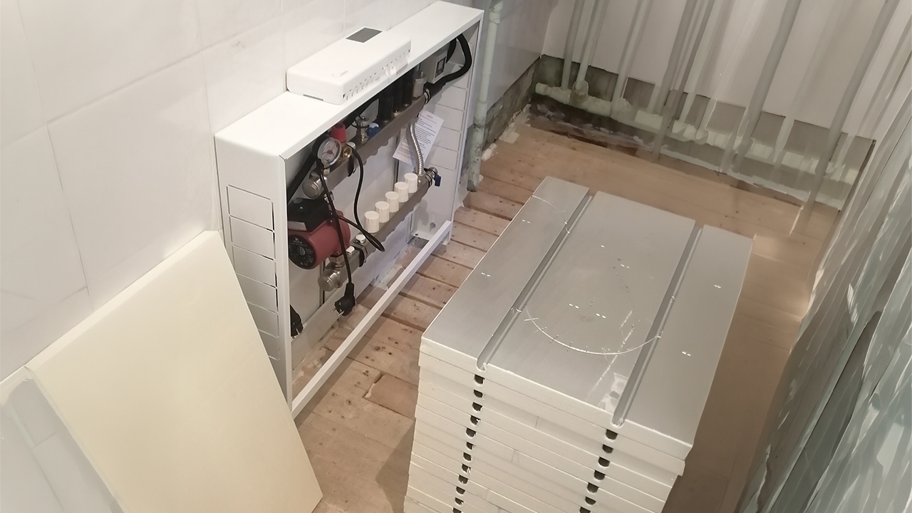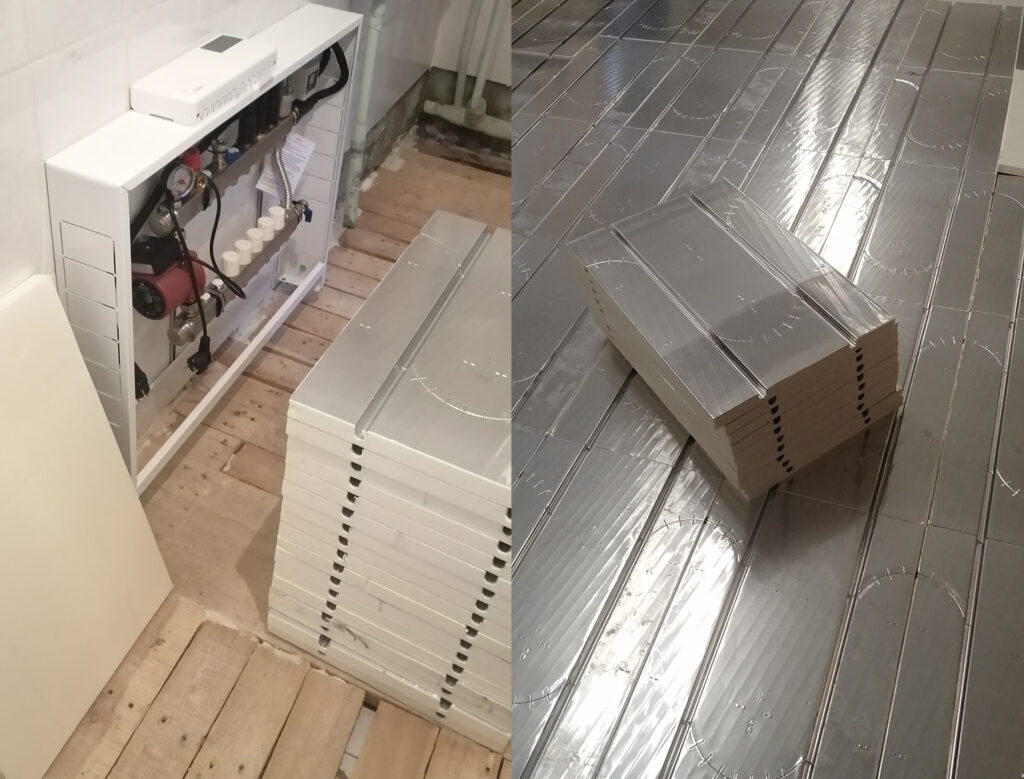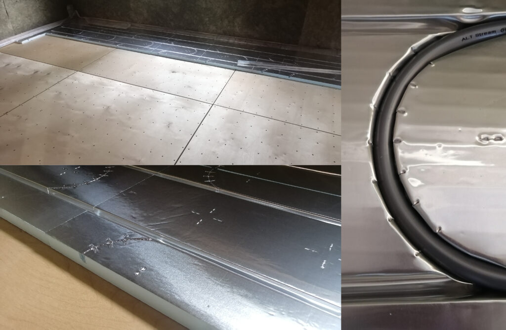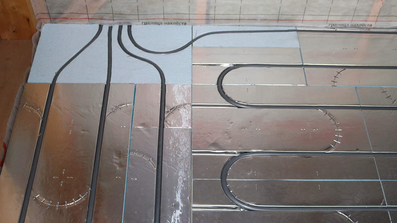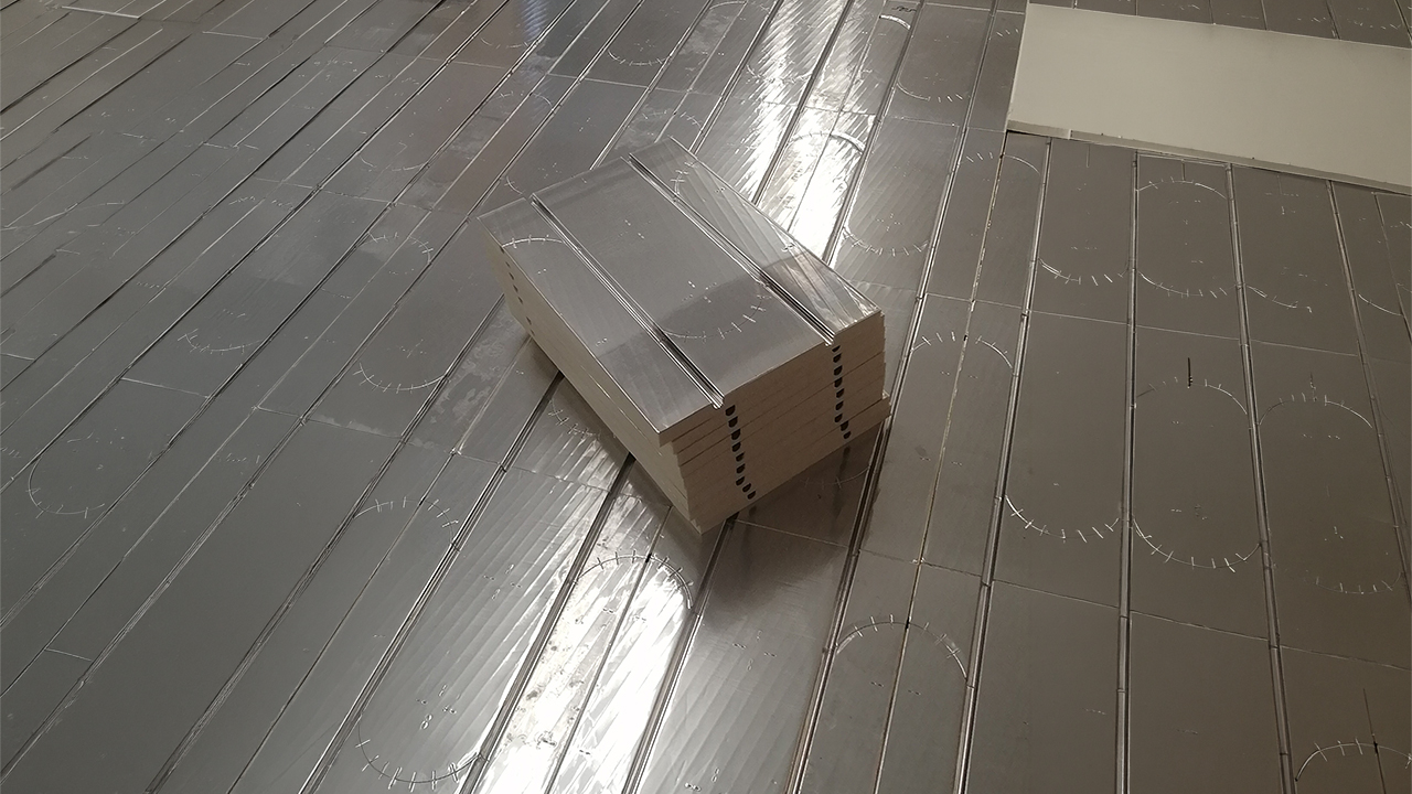 Основой теплого пола без стяжки является всего один единственный элемент — фольгированные маты 30х400х600 мм, изготовленные из экструдированного пенополистирола высокой плотности толщиной 30 мм, с приклеенной в верхней части толстой фольгой 150 мкм, плотно прилегающей к трубам теплого пола за счет Омега-образного профиля.